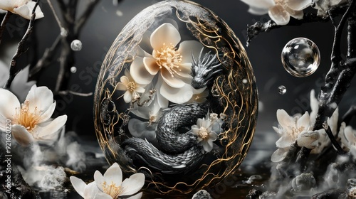 Naklejka premium Inside the glass egg is a gray dragon with a soft gray skin texture