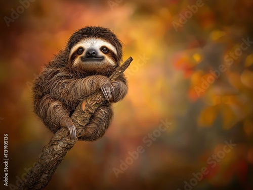 © jitthanant, Fototapeta premium Inside the studio, a sloth clinging to a tree branch is arranged against a blurred rainforest background with soft lighting capturing its shaggy fur and slow elegance