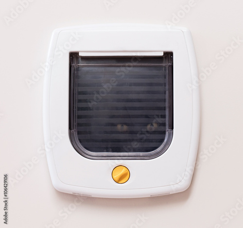 Fototapeta premium Inside view of a regular white cat flap, cat comming through