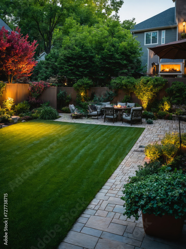 Fototapeta premium Inspiration for a Saturated Urban neighbourhood, Cozy Urban House, wide shots of home gardens, lawns, yards, decks and spaces for outdoor entertaining, building design, modern architecture concept