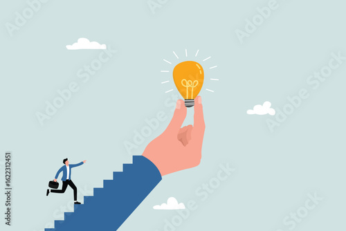 © NASIH, Obraz premium Inspiration idea to inspire or motivate people to success, business innovation or creativity, solution or invention concept, businessman step on stair of big hand holding inspiring bright lightbulb.