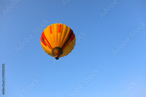 © Andriy Medvediuk, Naklejka premium inspiration or travel background, colorful hot air balloon in blue sky. Balloon with blue sky background launch at festiva. place for text