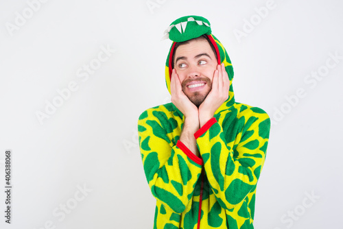 Fototapeta premium Inspired Young caucasian man wearing a pajama standing against white...