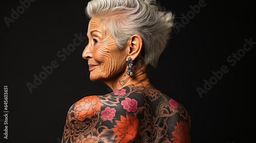 © XaMaps, Fototapeta premium Inspiring elderly lady with white hair revealing back tattoos, oozing confidence on a plain backdrop, vibrantly symbolizing self-expression and grace in aging.