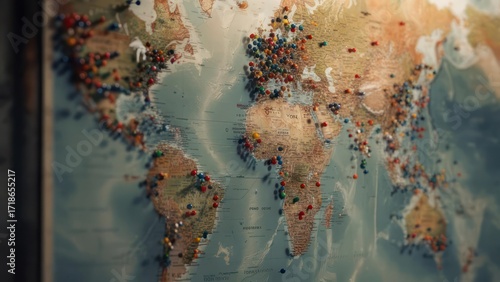 © Adib, Naklejka premium Inspiring world map adorned with colorful pins marking global destinations and adventures, igniting wanderlust for travel planning.