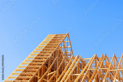 Obraz premium Installation beams of wooden roof trusses to house under construction
