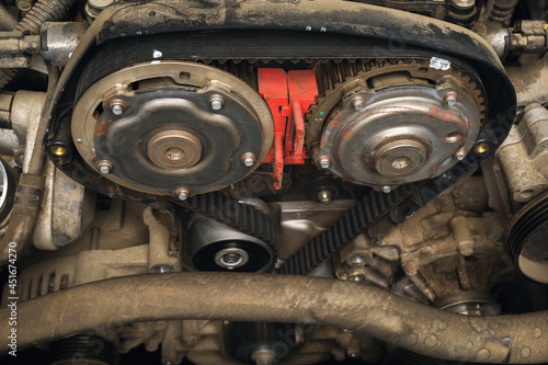 Naklejka premium Installed new timing belt on camshafts, close-up