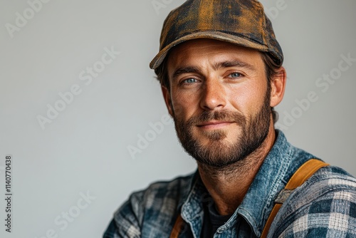 Fototapeta premium Installer in helmet and overalls, with a confident and cheerful expression for versatile campaigns.