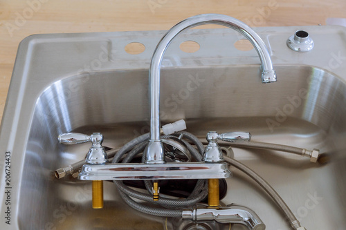 © ungvar, Obraz premium installing a stainless steel kitchen sink.