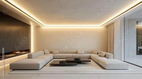 © Sukon, Fototapeta premium Installing sleek modern LED lighting enhances a minimalist living room.