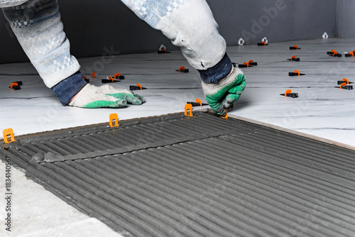 © Natallia, Obraz premium Installing the tiling system (clips) before laying tiles.