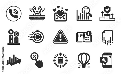 Naklejka premium Instruction info, Call center and Air balloon icons simple set. Wifi, Phone repair and Growth chart signs. Reject click, Ab testing and Seo timer symbols. Flat icons set. Vector