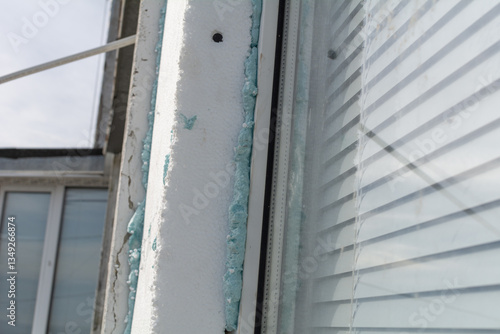 © natalyamatveeva, Fototapeta premium Insulation of the facade of a panel house with foam plastic. Window insulation. Selective focus, shallow depth of field