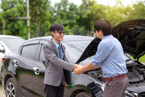 © amnaj, Fototapeta premium Insurance agent handshake with customer. Car insurance.