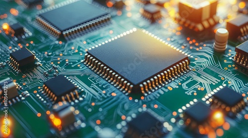 Obraz premium Integrated Circuit Board Shows Complex Microchip Technology