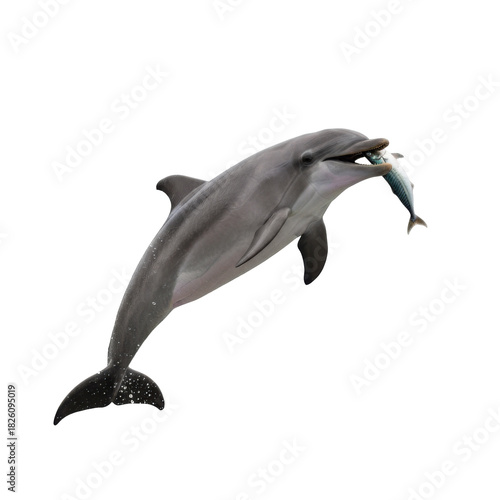 Fototapeta premium Intelligent dolphin captured mid-leap with a fresh fish in its mouth isolated...