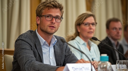 © pimnada, Obraz premium Intelligent Man with Glasses Deep in Thought in a Bright Room Setting