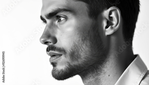Obraz premium Intense black and white profile portrait of man with stubble.
