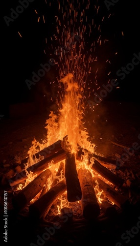 Obraz premium Intense bonfire with bright flames and sparks in dark night setting