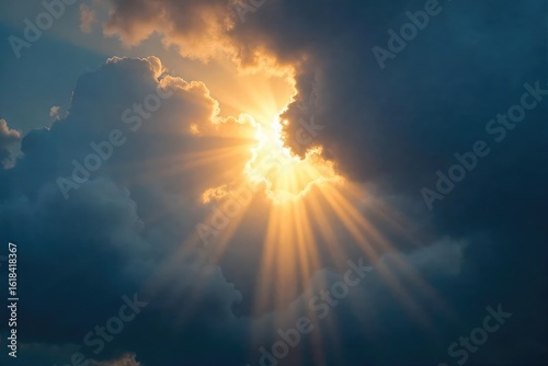 Fototapeta premium Intense burst of sunlight breaking through dark clouds, creating a dramatic...