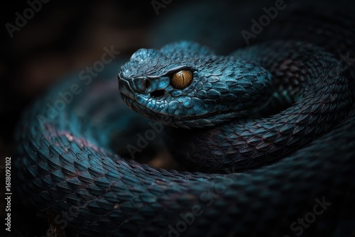 Fototapeta premium Intense close up of a blue viper with piercing orange eyes