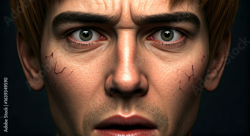 © Arek, Fototapeta premium Intense close-up of a man's face showing distress with cracking skin a dramatic visual metaphor for vulnerability or deterioration perfect for psychological themes digital art or abstract concepts
