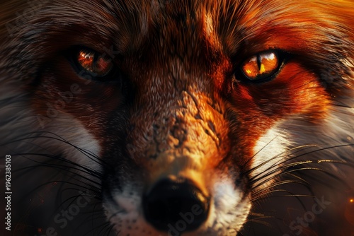 Fototapeta premium Intense close up of a red fox with glowing eyes and fur, creating a dramatic...