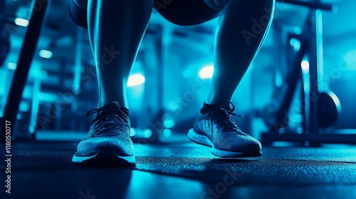 Fototapeta premium Intense Close-Up of Athlete's Legs in Workout Gear Engaging in Fitness Training in Dimly Lit Gym with Blue Lighting Atmosphere