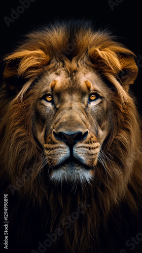 © tiagozr, Fototapeta premium Intense close-up portrait of a lion against a dark background.