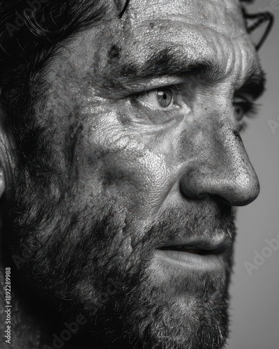 © Sagar, Obraz premium Intense Close-Up Portrait of Determined Man with Rugged Features in BW