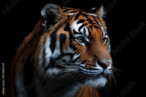 © Wannaeka, Fototapeta premium Intense Close-Up Portrait of Tiger with Piercing Eyes on Black Front view Sumatran isolated