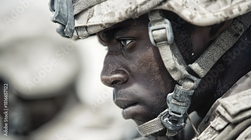 Obraz premium Intense close-up profile of a Black soldier in combat uniform and helmet.
