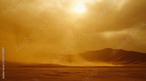 © NAIMAH, Fototapeta premium Intense desert dust storm with sun behind hazy clouds and mountains.