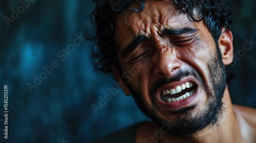 © Artem Zatsepilin, Fototapeta premium intense emotional breakdown of arabian man. raw grief and despair expression, upset middle eastern man crying, close up portrait with copy space. shock and depression.