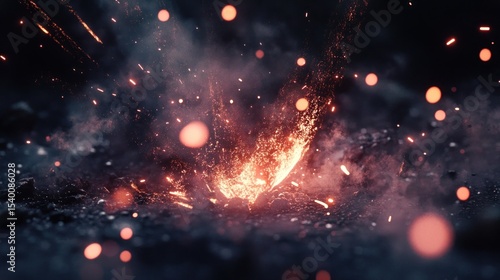 Fototapeta premium Intense fire explosion on dark ground with sparks and smoke.