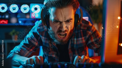 © thekob5123, Fototapeta premium Intense Gamer Streaming Live During Speedrun Session