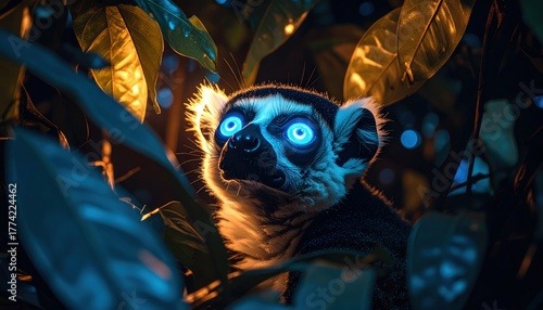 © meka, Obraz premium Intense gaze: A blue-eyed lemur peers upward, surrounded by glowing foliage