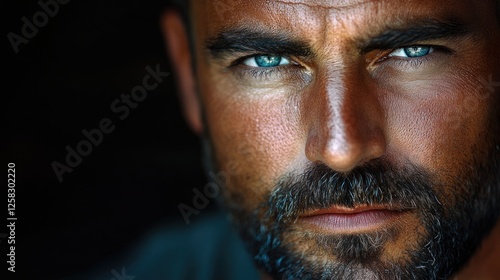 Fototapeta premium Intense gaze, man, portrait, dark background, advertising