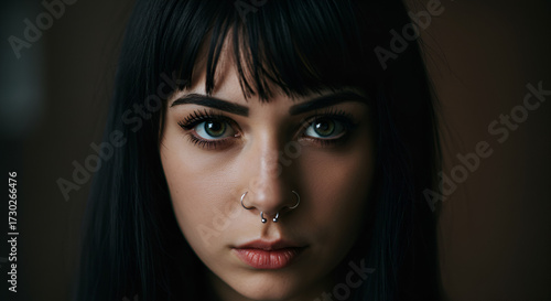 Fototapeta premium Intense gaze of a young woman with piercings and dark, captivating eyes