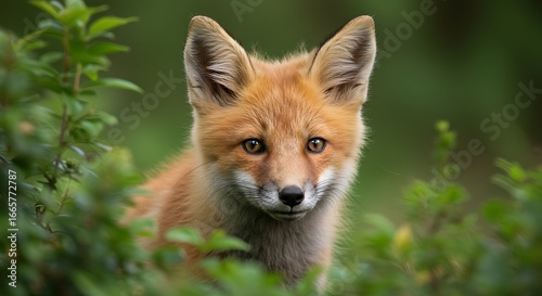 © loxia stock image, Fototapeta premium Intense Gaze: Red Fox Portrait Amidst Lush Greenery, Capturing Wild Beauty