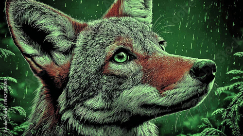 © XtravaganT, Fototapeta premium Intense Green-Eyed Fox in a Rainy Forest