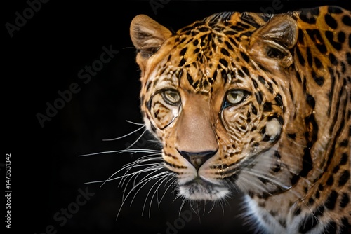 Obraz premium Intense Leopard Close-Up Portrait – Realistic Wildlife Focus with Dark...