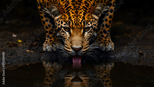 Obraz premium Intense Leopard Drinking Water with Perfect Reflection