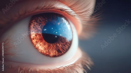 © Habibur614, Fototapeta premium Intense macro of a mesmerizing eye reflecting a starry night sky, perfect for science, mystery or fantasy themes, evoking wonder and cosmic beauty