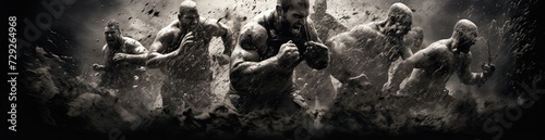 © Marharyta Tsapenko, Fototapeta premium Intense nighttime marathon runners splashing through mud and water.