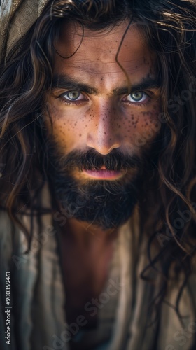 Fototapeta premium Intense Portrait of a Bearded Man with Freckles. Rustic and Natural Look.