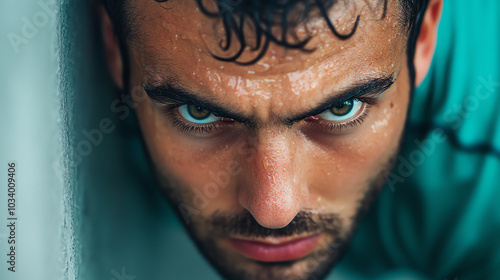 Fototapeta premium Intense portrait of a focused male athlete, showcasing determination. Sweat glistens on his skin, capturing a moment of raw emotion and effort.