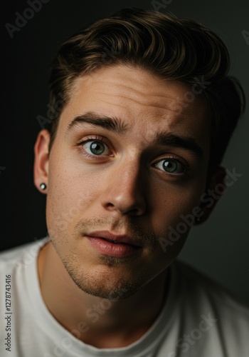 Fototapeta premium Intense Portrait of a Handsome Young Man with Blue Eyes on Dark Background