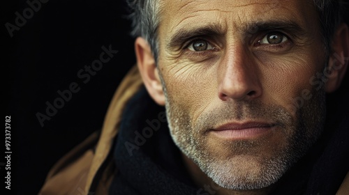 © mariiaplo, Fototapeta premium Intense Portrait of a Mature Man with Grey Stubble and Piercing Eyes