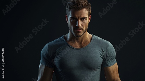© Nathan, Naklejka premium Intense Portrait of a Muscular Man with a Serious Expression Against a Dark Background